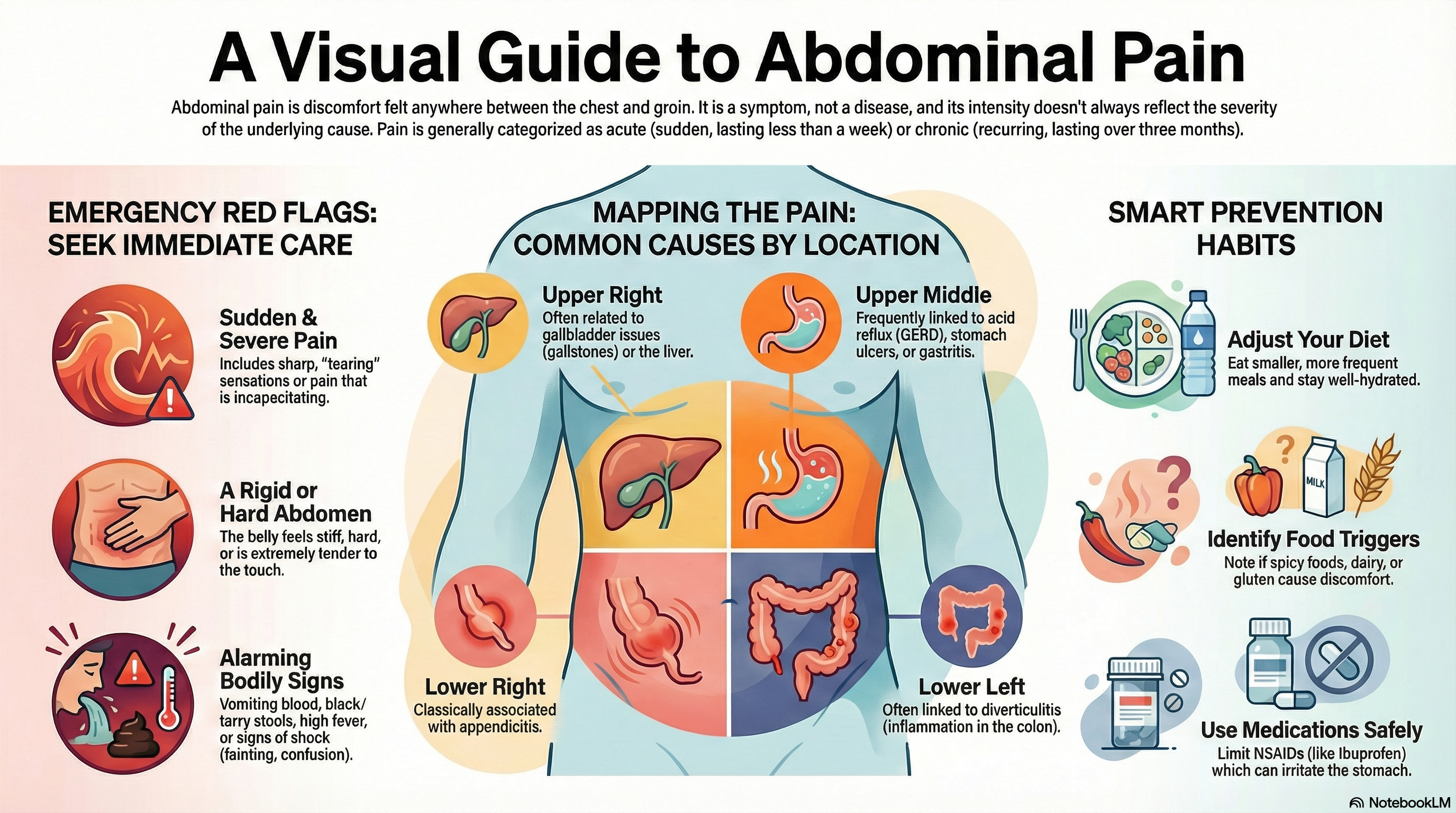 Abdominal pain—often referred to as "stomach pain"—is discomfort felt anywhere between your chest and your groin. It is not a disease itself, but a symptom of an underlying issue. Doctors generally categorize this pain into two types: