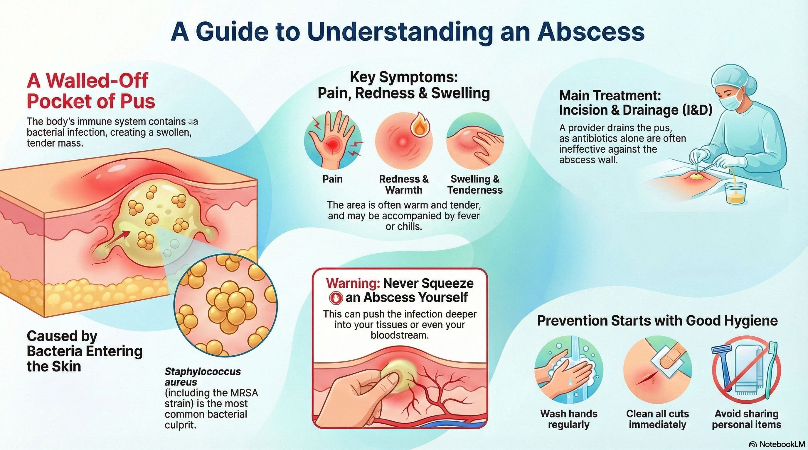Post-Procedure Care: After drainage, keep the area covered with a clean, dry dressing. Never attempt to squeeze or pop an abscess yourself, as this can push the infection deeper into your bloodstream or surrounding tissues.