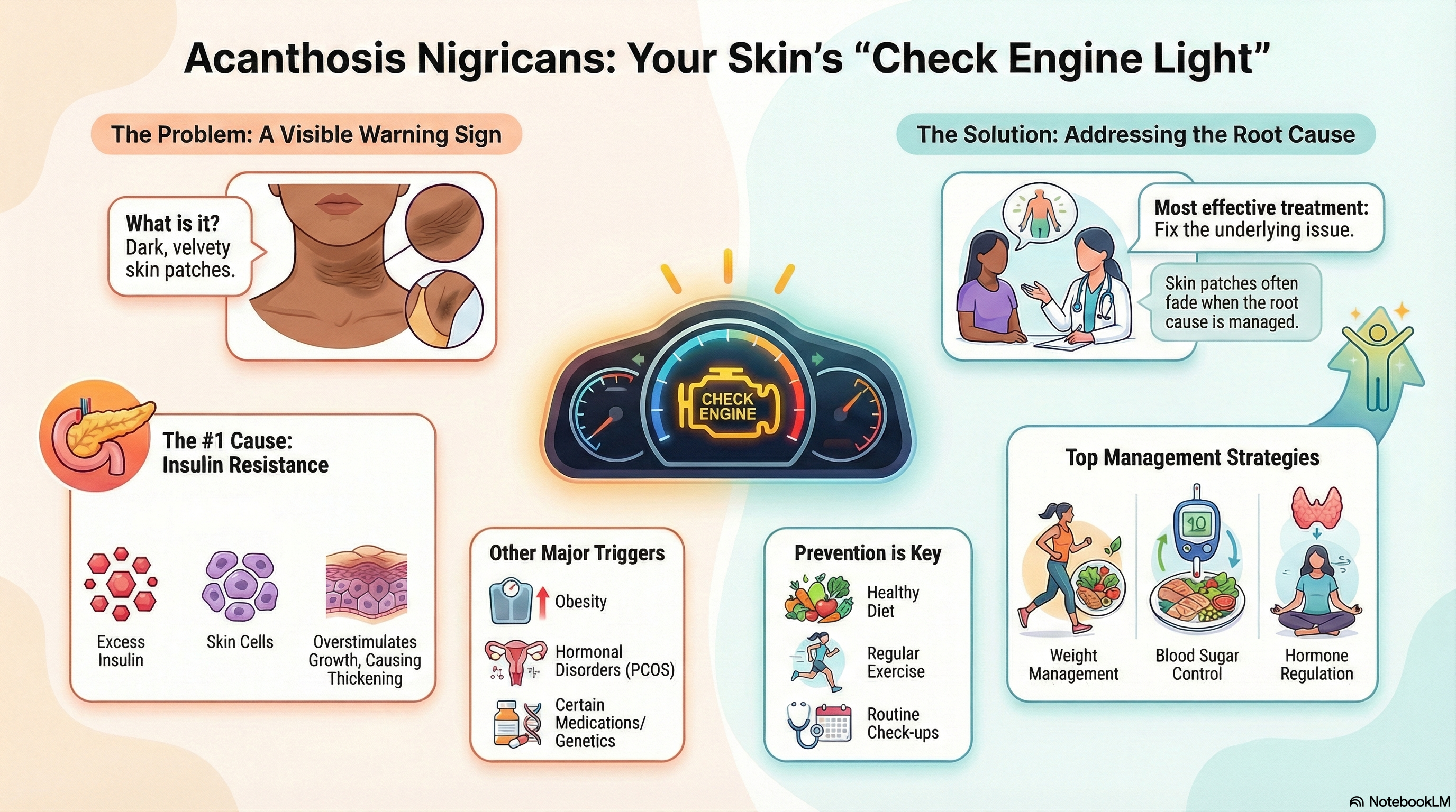 The most common driver of acanthosis nigricans is insulin resistance. When your body has too much insulin circulating in the blood, it can overstimulate skin cells, causing them to reproduce rapidly and thicken.