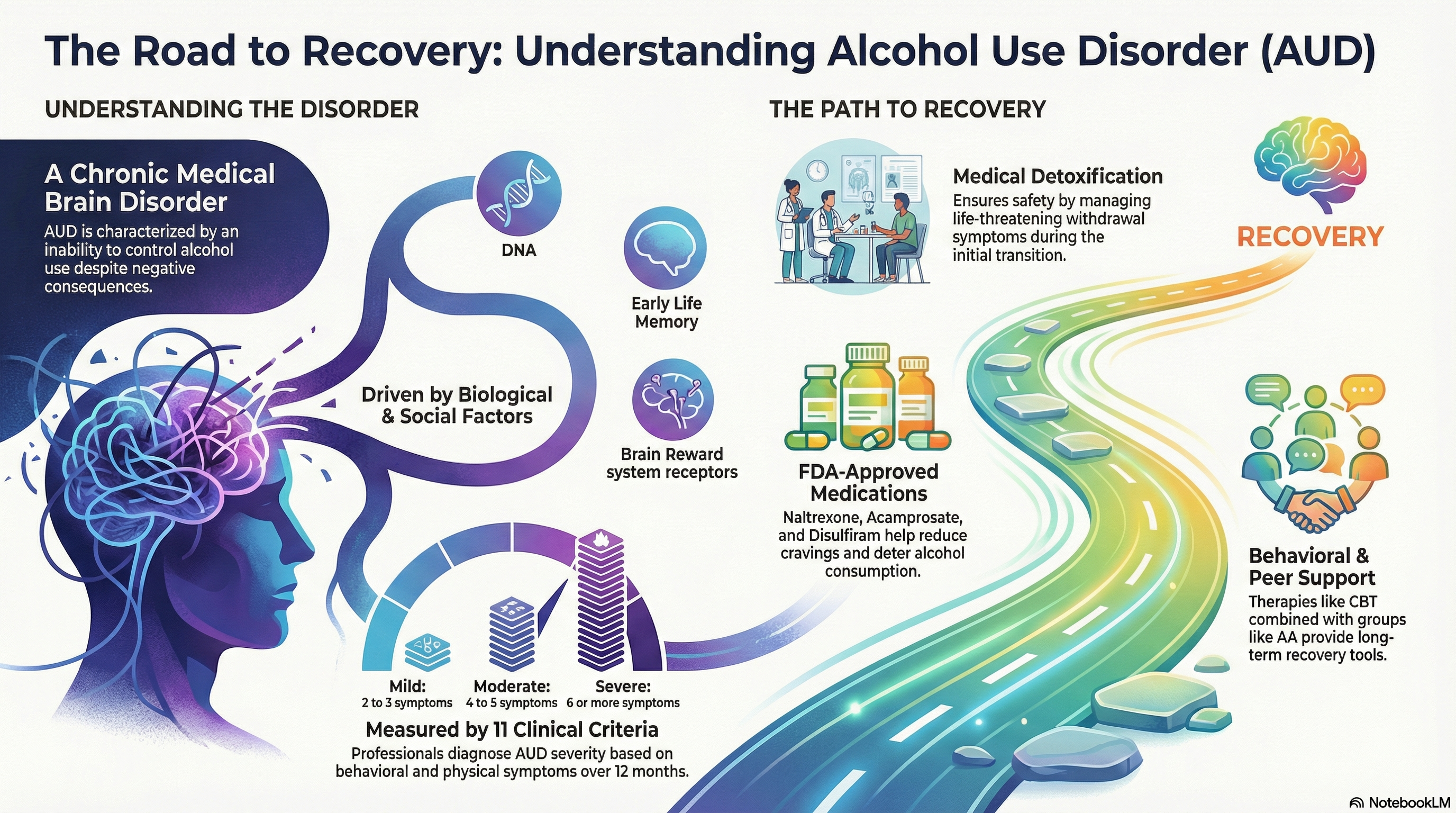 In the United States, AUD affects approximately 11% of the population. It is a complex condition involving changes in the brain’s neurobiology—specifically affecting dopamine and reward systems—which makes stopping a challenge without professional support. To reduce stigma and reflect its nature as a treatable medical condition, healthcare professionals prefer the term "Alcohol Use Disorder" over older terms like "alcohol abuse" or "alcoholism."
