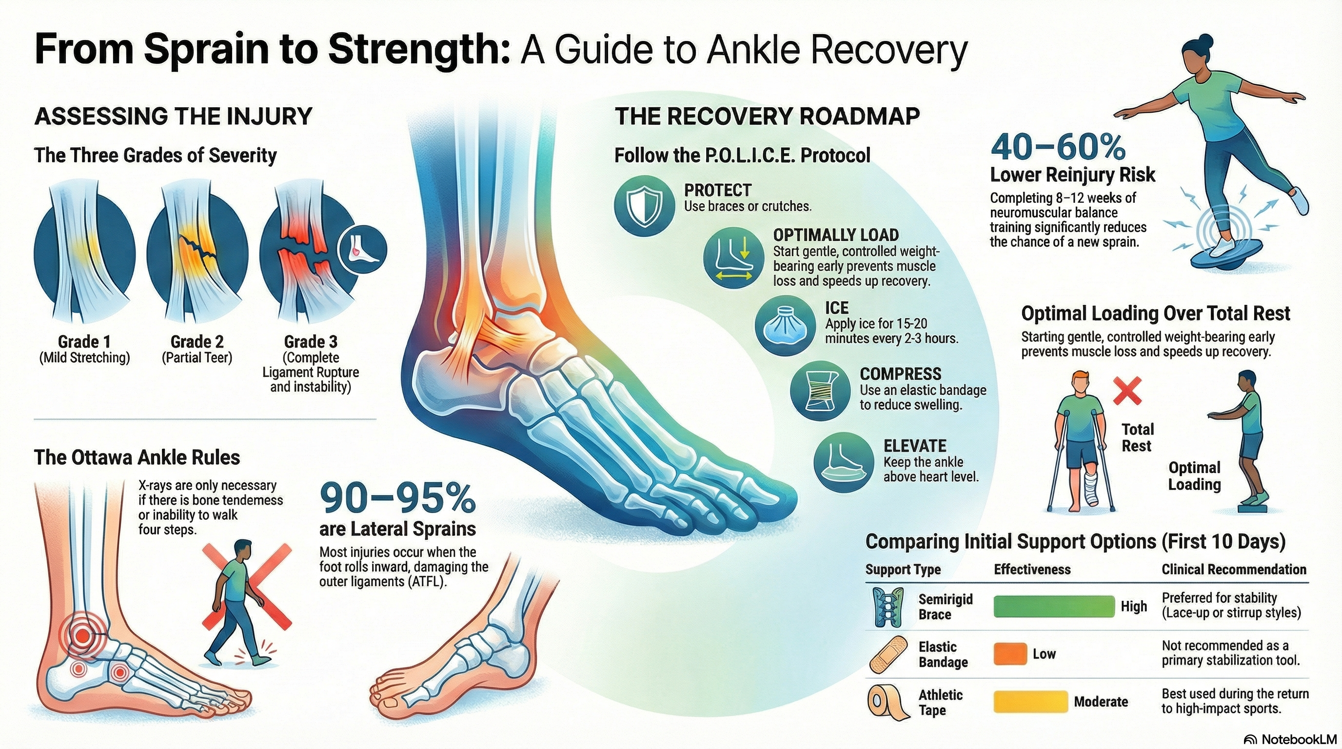 Neuromuscular Training: Engaging in balance and coordination exercises for 8–12 weeks after the injury can reduce the risk of a new sprain by 40–60%.