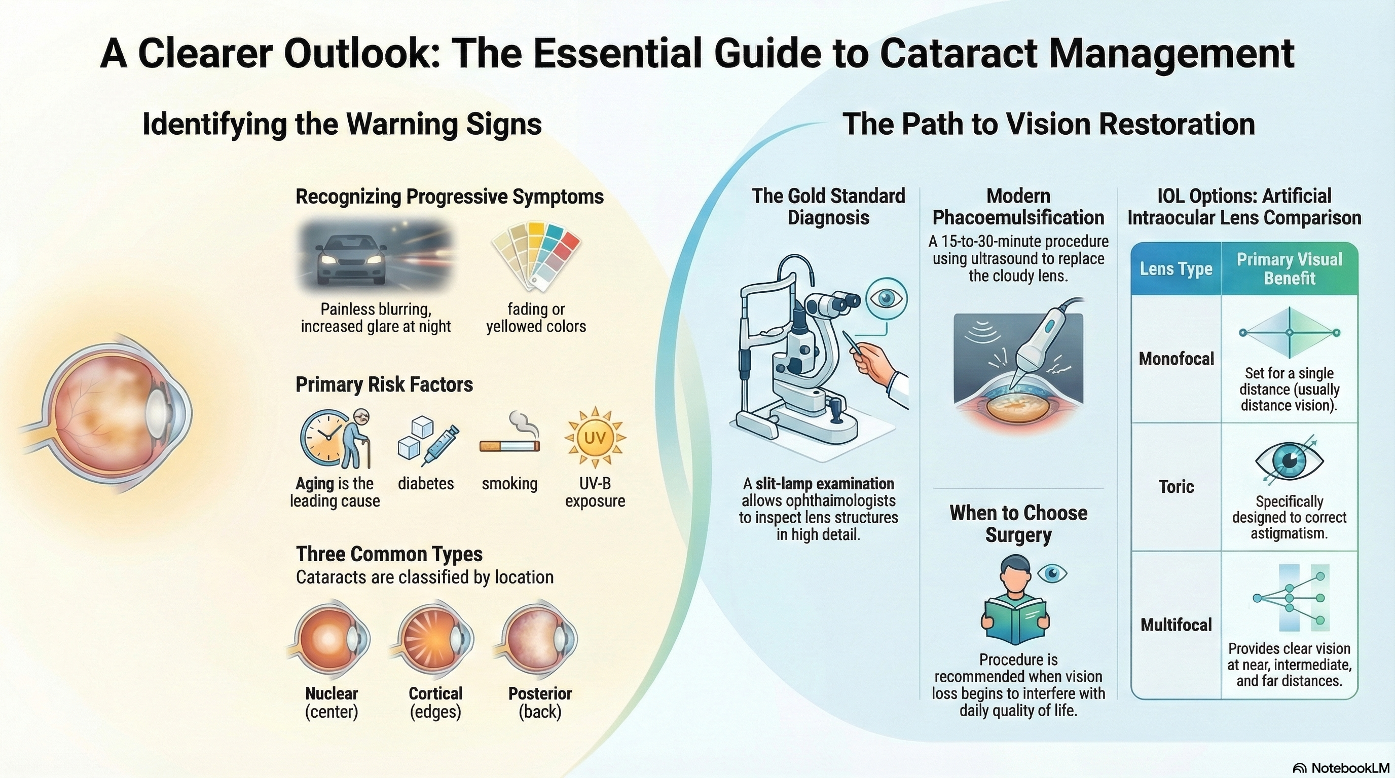 Modern Surgical Technique The standard procedure is Phacoemulsification. During this 15-to-30-minute procedure, a surgeon makes a tiny incision in the cornea, uses ultrasound waves to break the cloudy lens into small pieces, suctions them out, and replaces them with a clear artificial lens called an Intraocular Lens (IOL).
