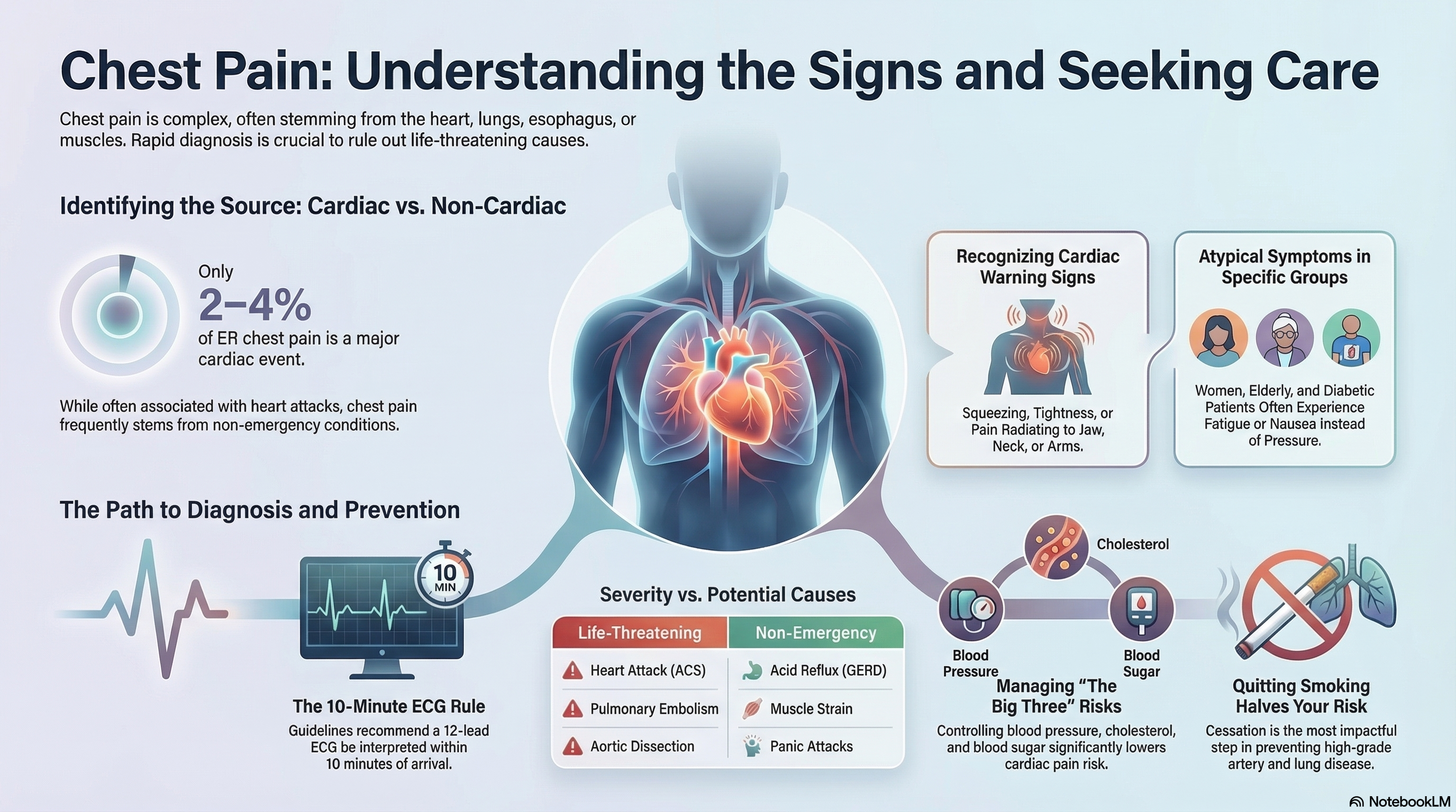 Clinical Decision Pathways: Doctors combine your age, history, risk factors (like smoking or diabetes), and lab results to decide if you can be safely discharged or if you need to be admitted.