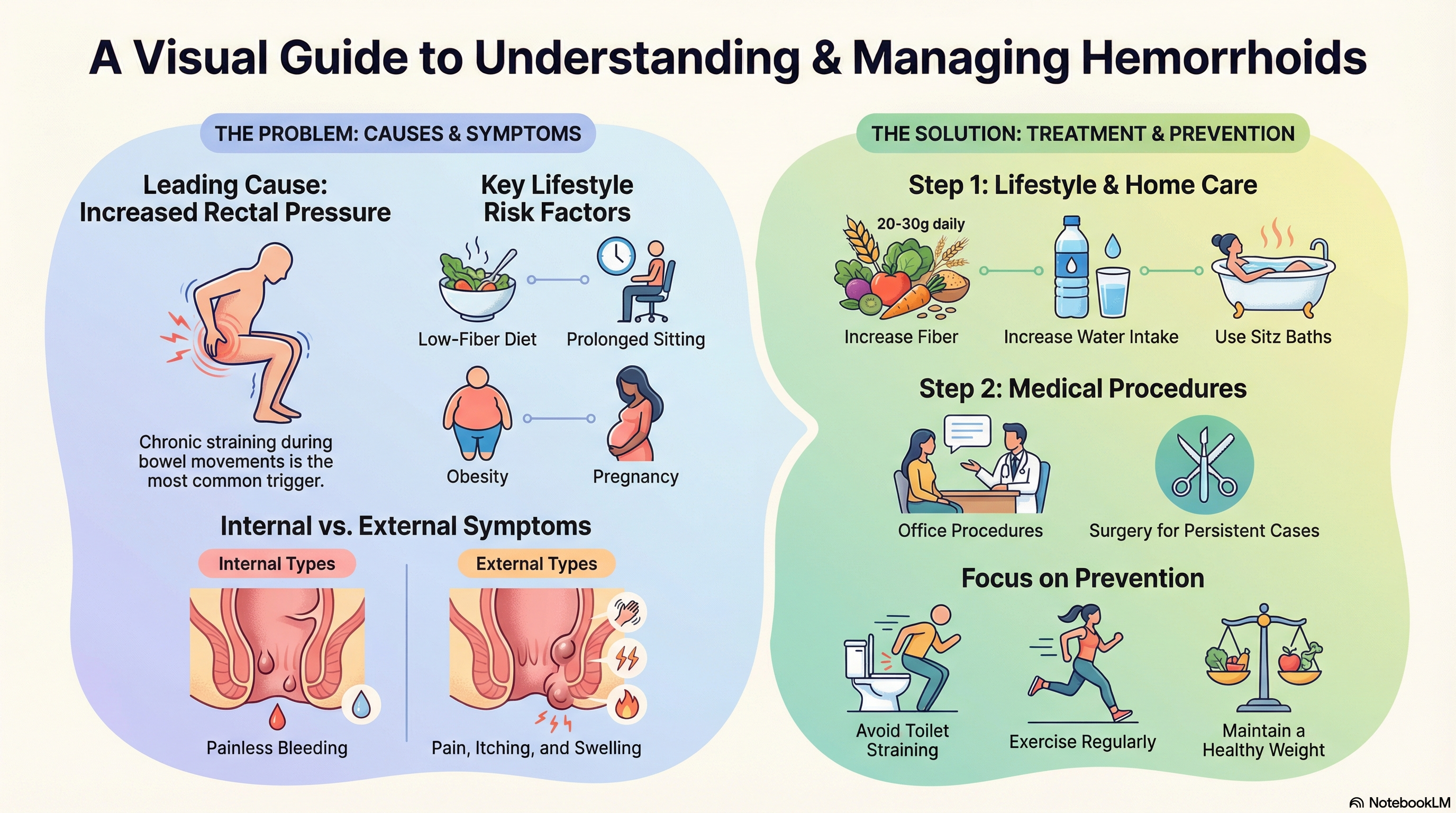 Conservative Management: First-line treatments include a high-fiber diet (20–30g daily), increased water intake, and warm "sitz baths" to soothe the area.
